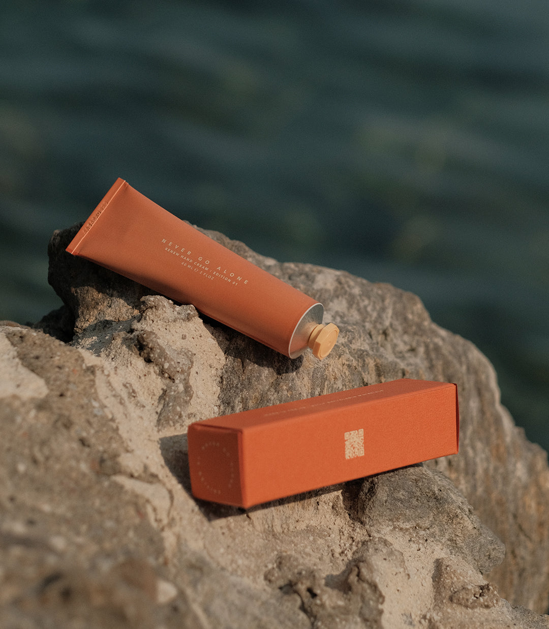 The renew hand cream is lightly scented, featuring grounding notes of Sandalwood and cardamom contrasted with lavandin and cedar, which are proven to reduce anxiety and improve mood.